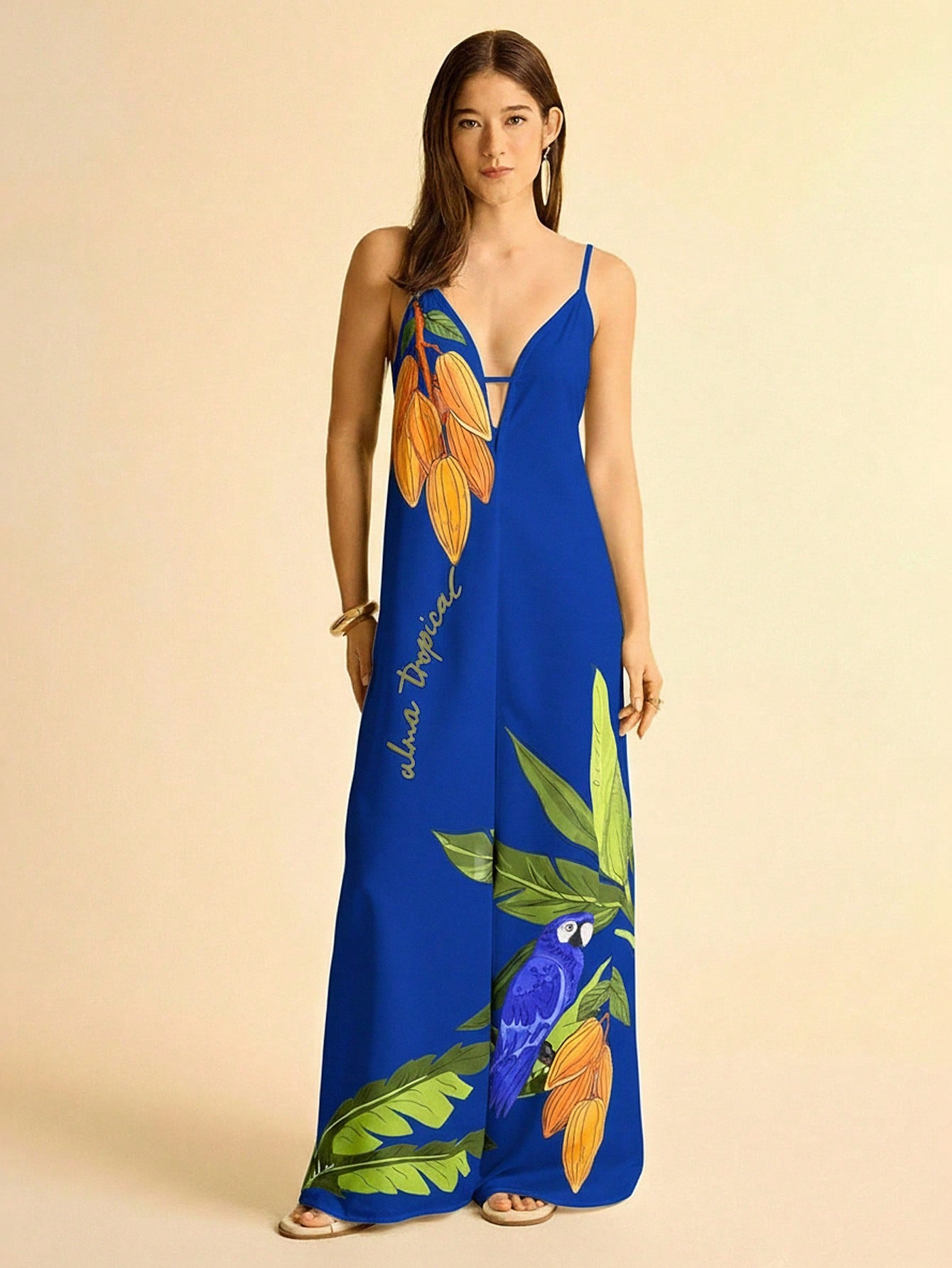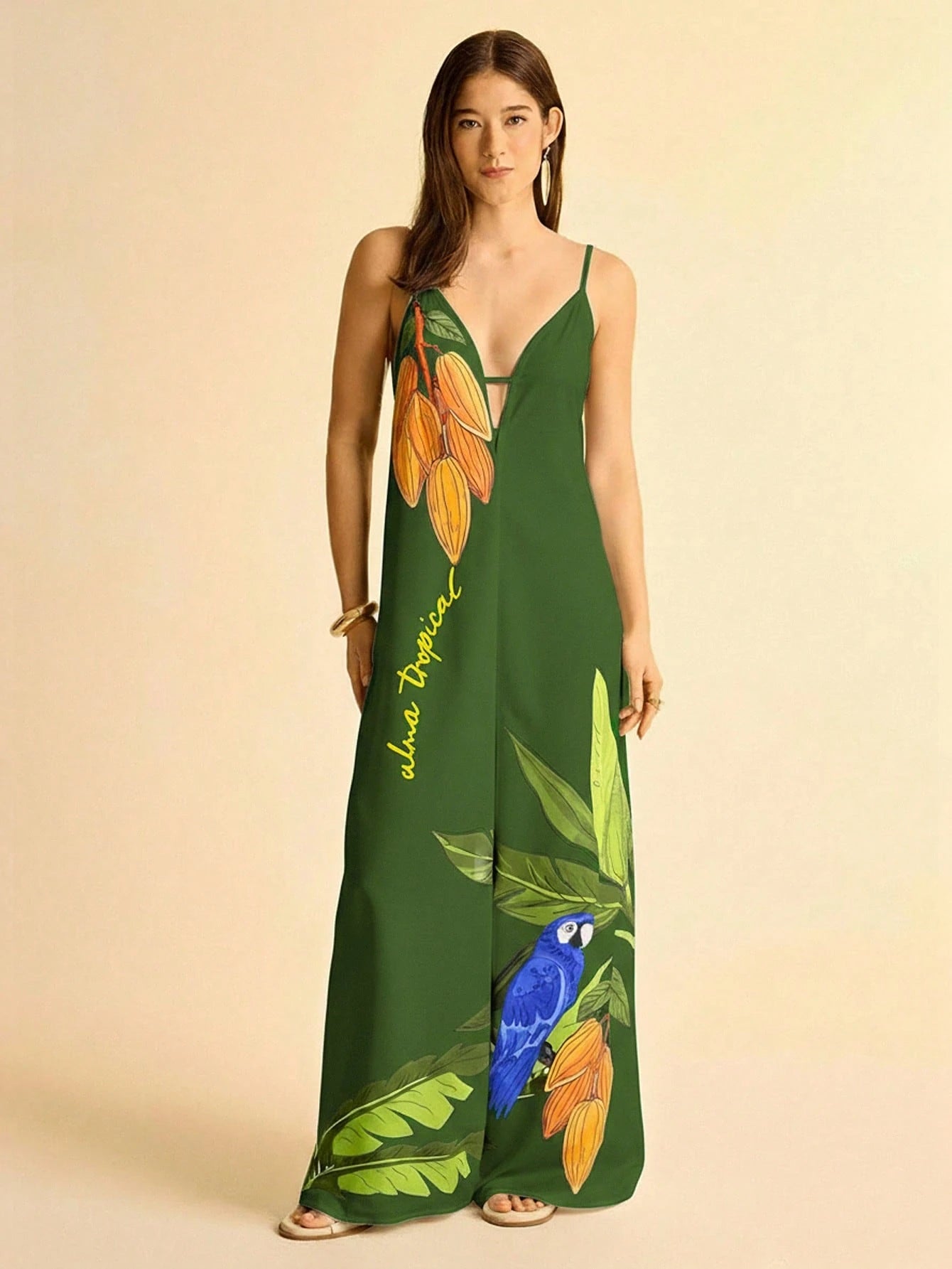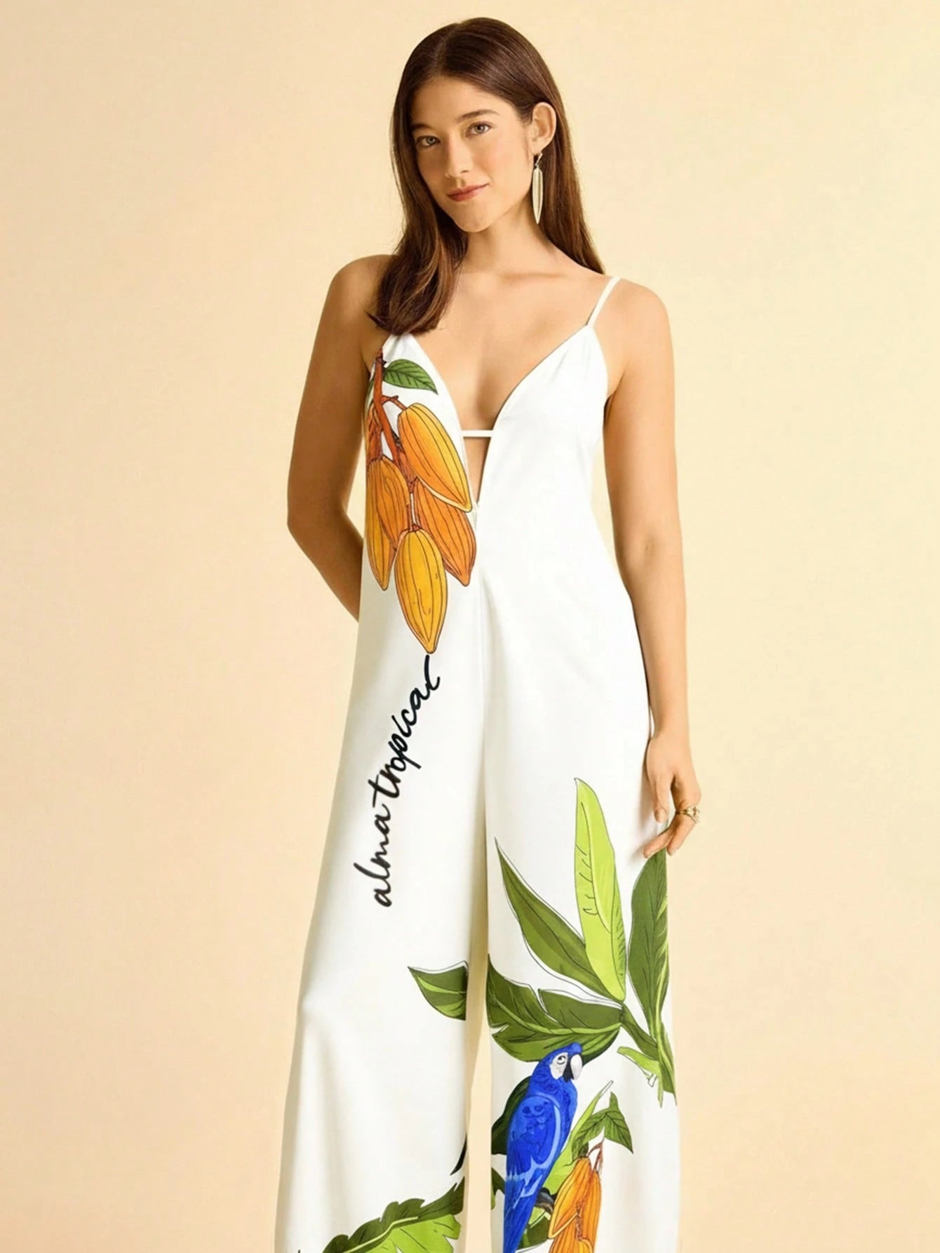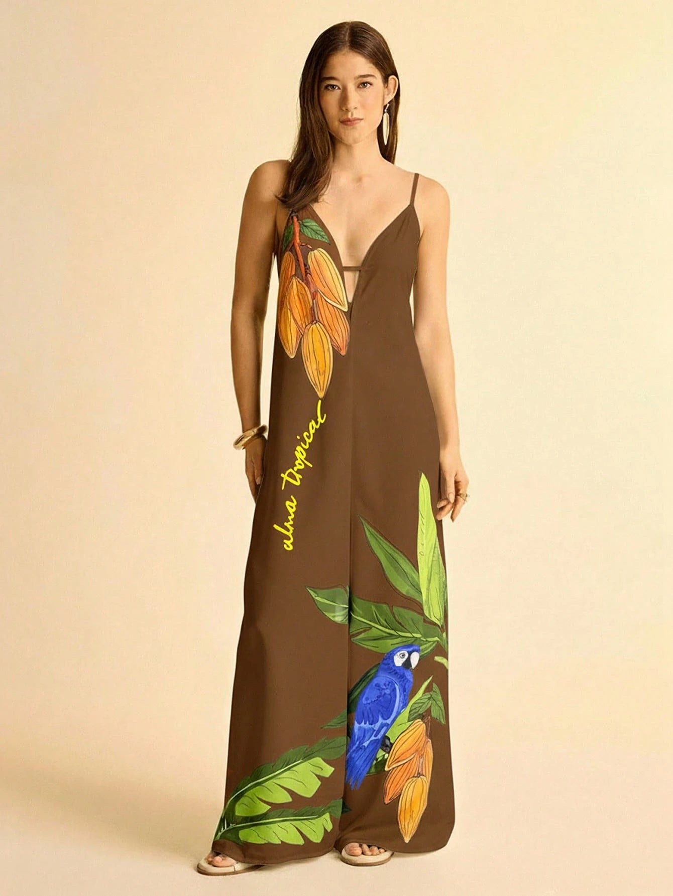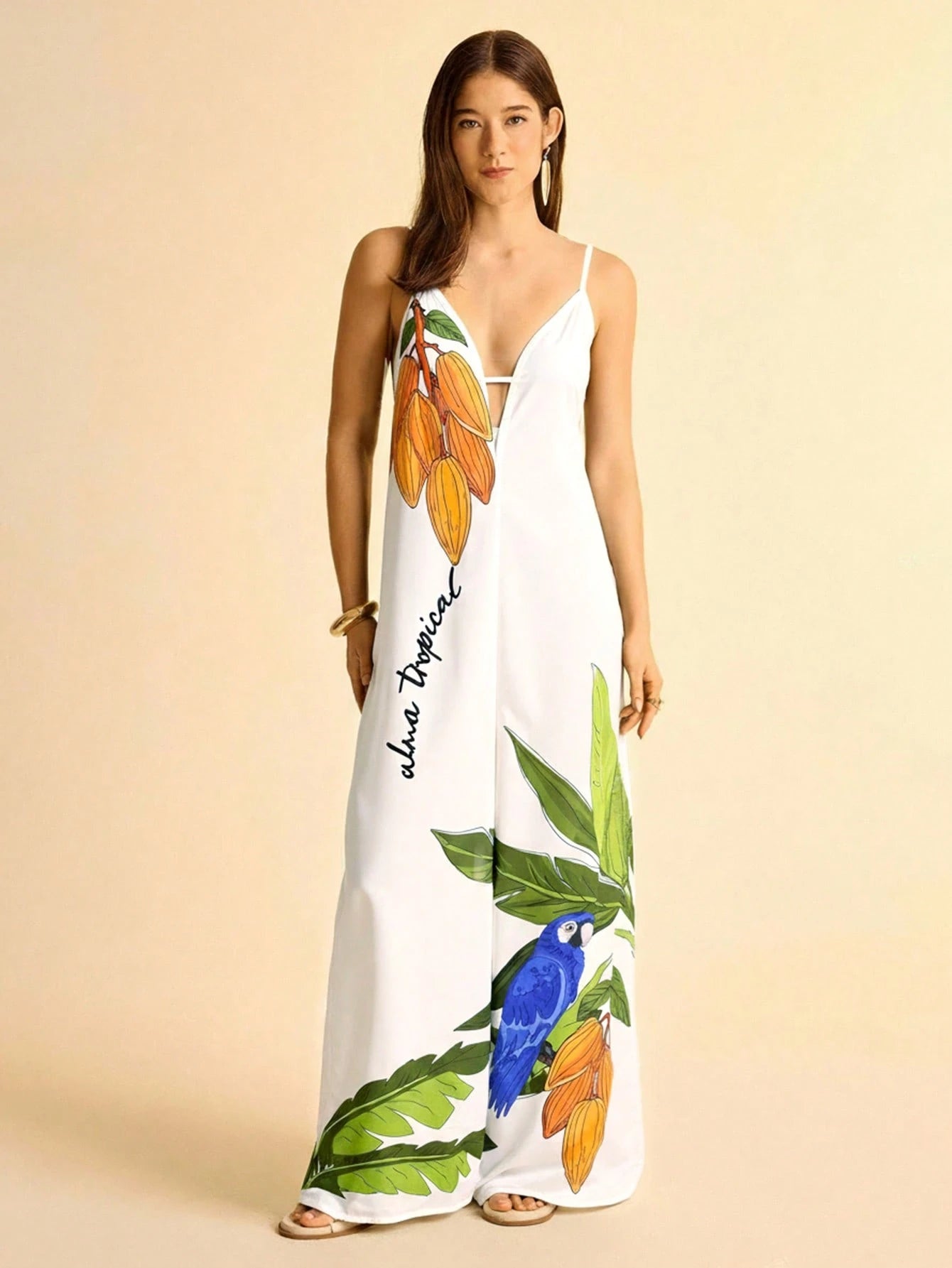 Leve, vibrante e perfeito para dias ensolarados, este macacão é a escolha ideal para quem ama o clima tropical. Com fundo em tom abricó (um laranja suave e sofisticado), a estampa de coqueiro e tucano traz um toque alegre e cheio de personalidade ao visual.