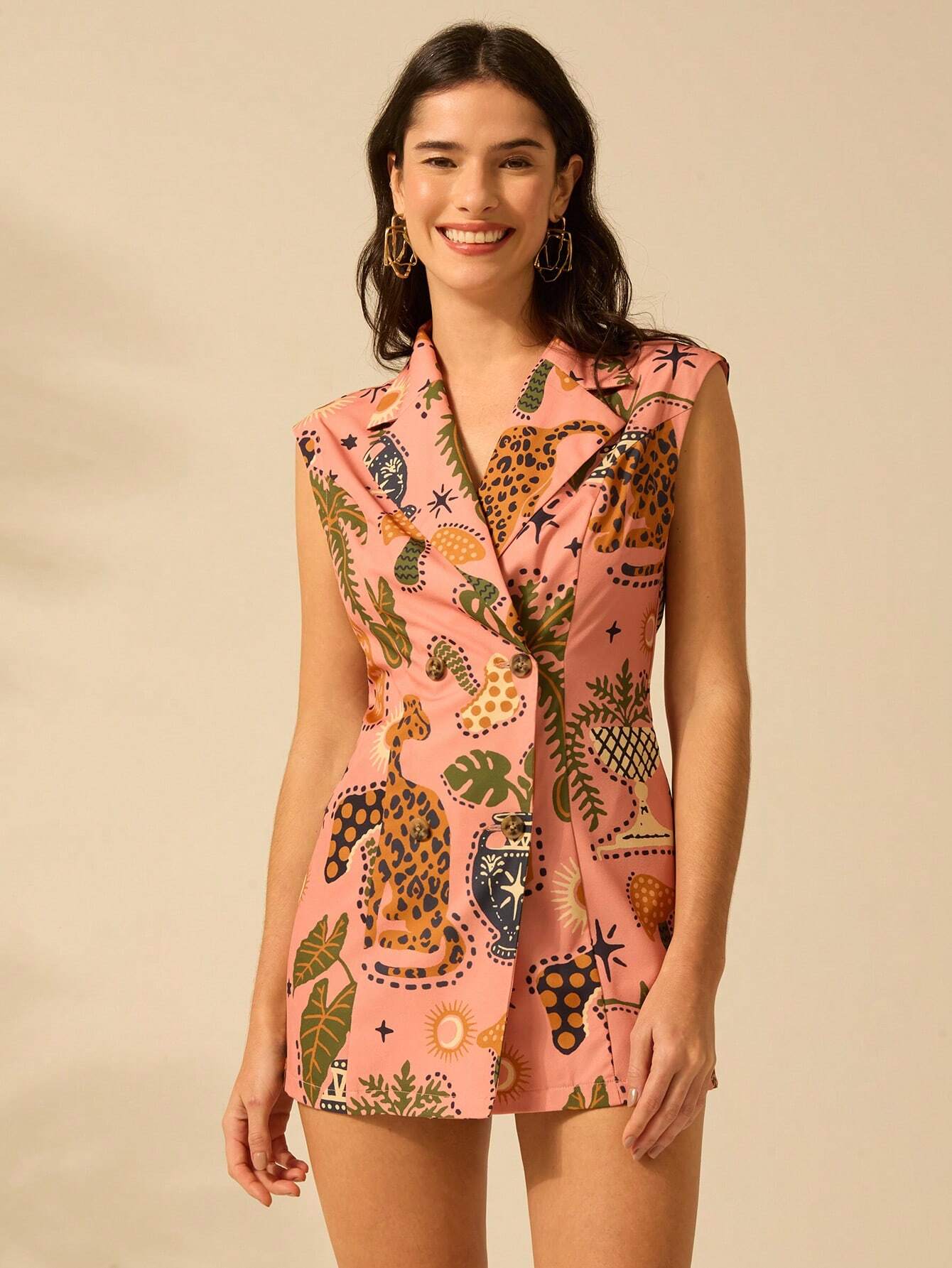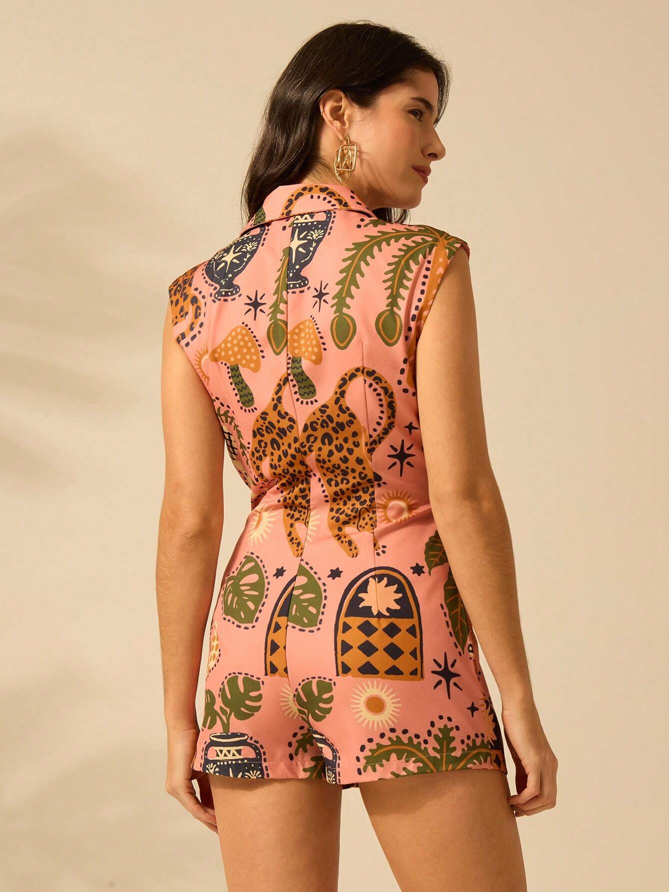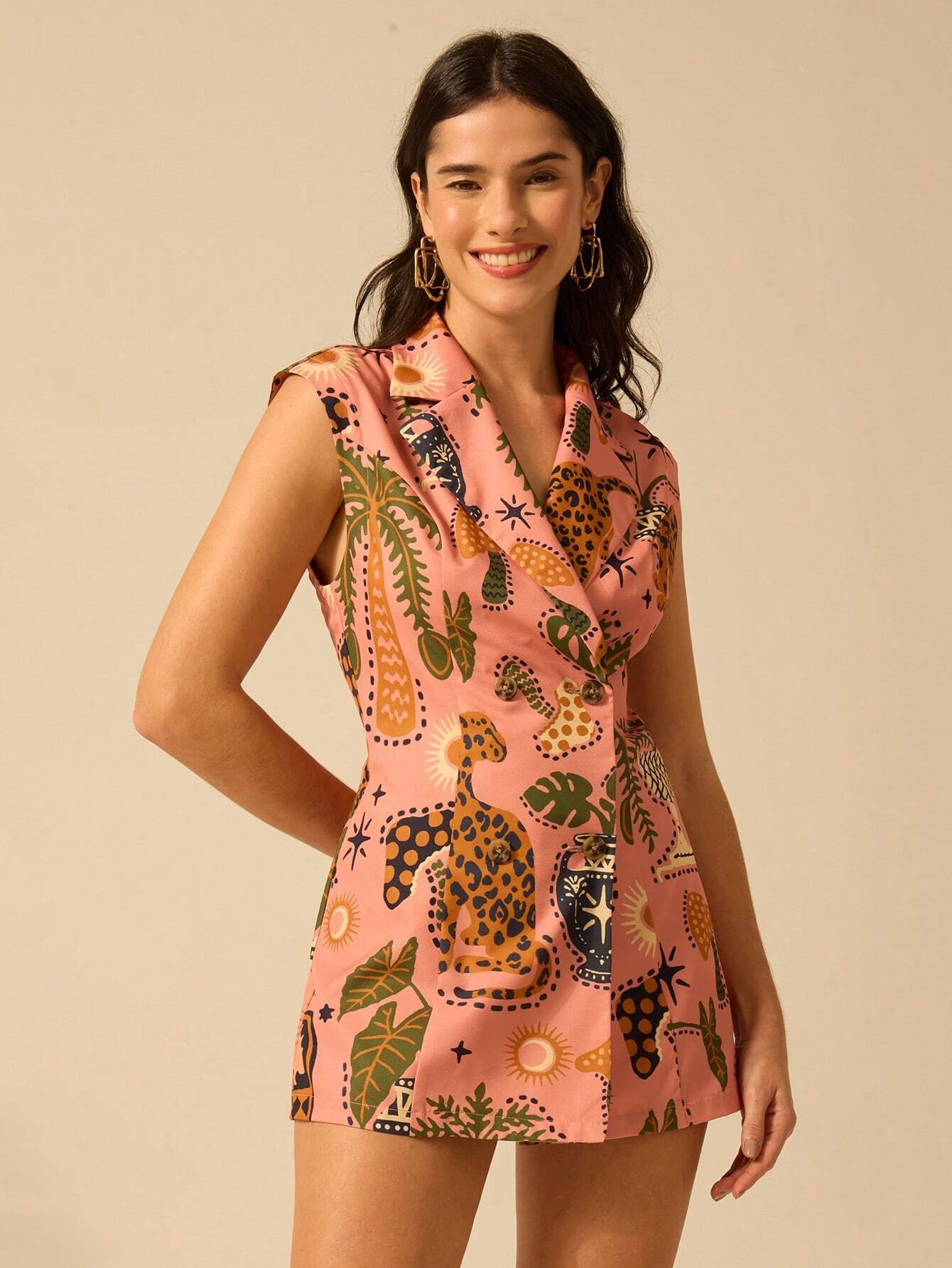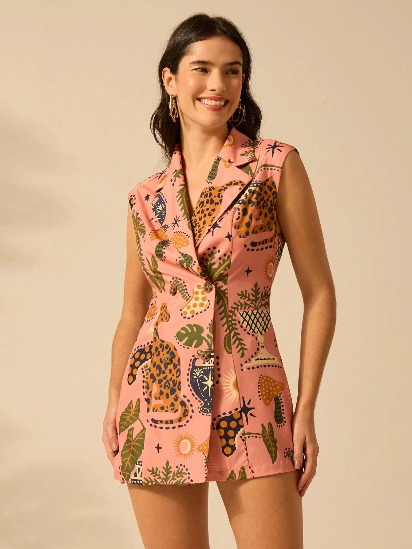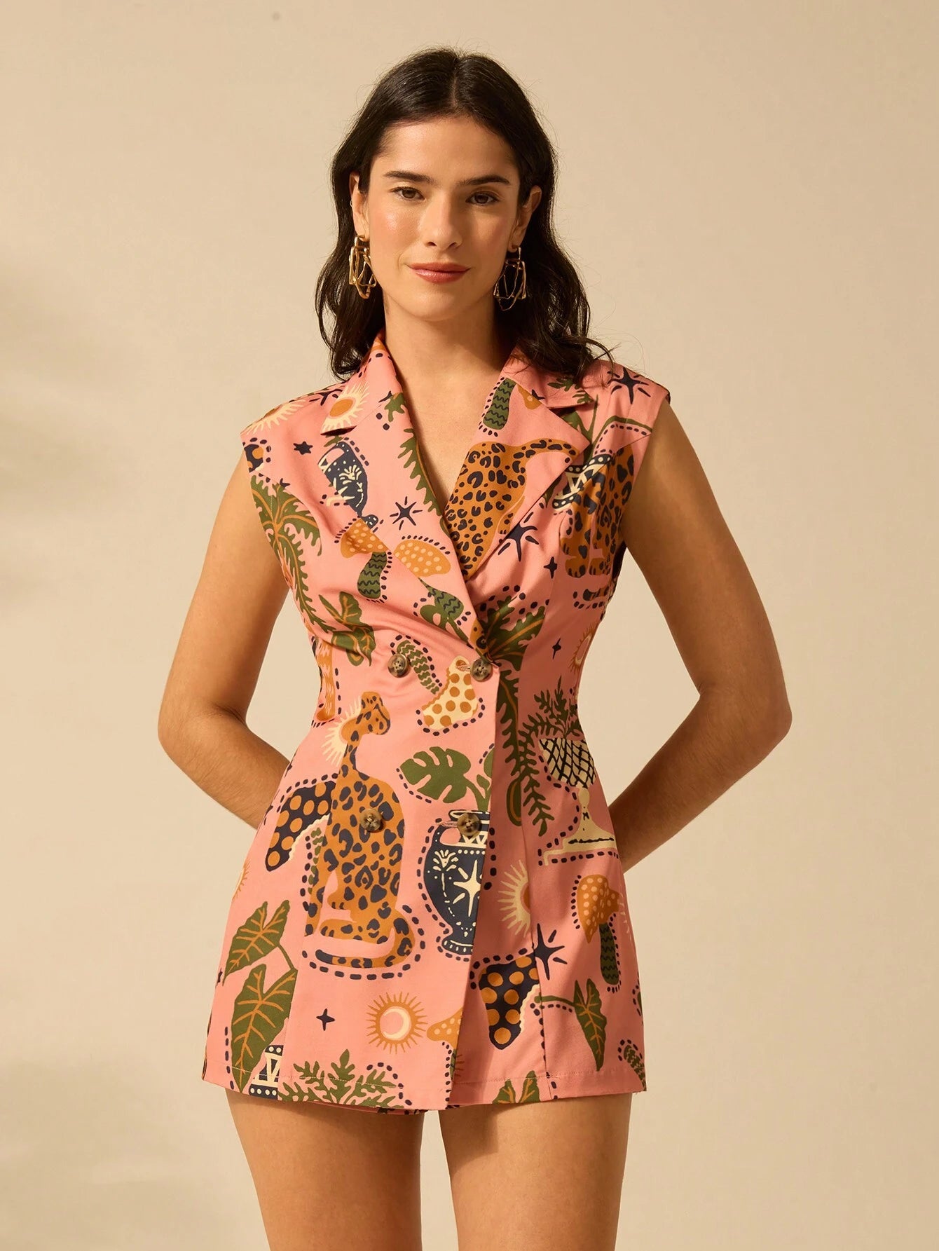 🌺 Macaquinho Feminino Curto com Colarinho de Terno – Estampa Boêmia Tropical Rosa